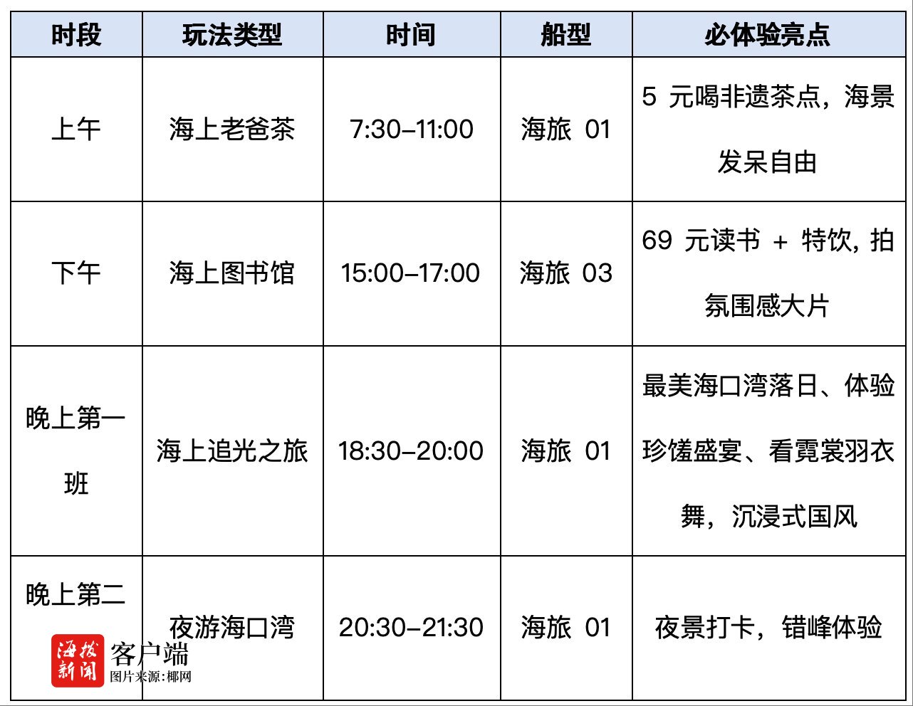据了解,此次海旅游船主题航次旨在丰富市民游客双节出行选择。10月1日起,市民游客可根据需求选择对应航次,在海口湾的碧波之上开启海上旅程。